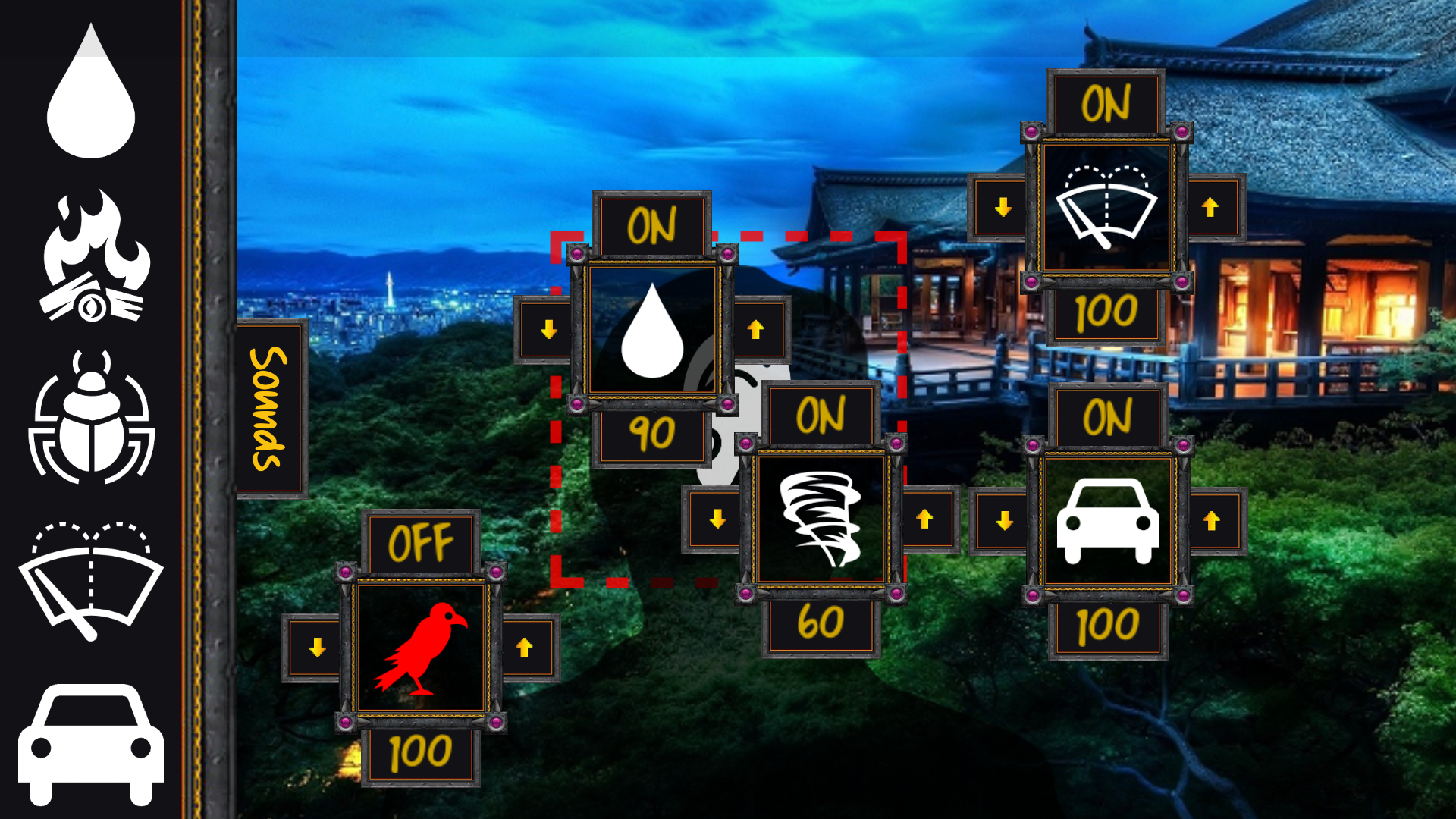 9 sounds are available, among which : rain, fireplace, grasshoppers, beach, etc.