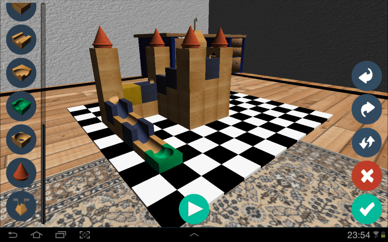 We have been inspired by a wooden toy where the child creates a circuit with wooden bricks, places a marble at the top of the circuit and observes it going down the slope.